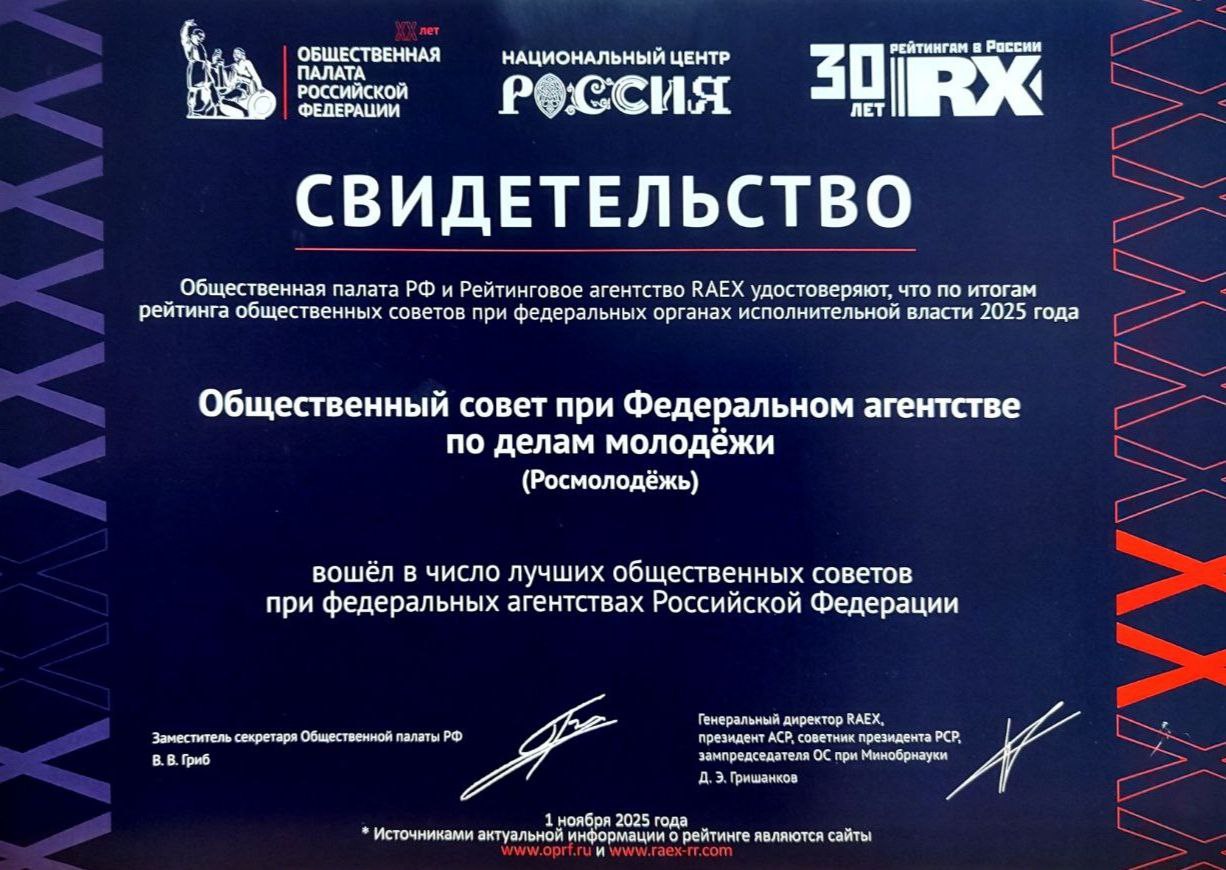 Общественный совет при Росмолодёжи в 2025 году вошел в число лучших общественных советов при федеральных агентствах рейтинга общественных советов при федеральных органах власти по версии агентства RAEX – партнера Общественной палаты РФ.